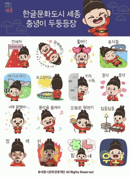 À̸ðƼÄÜÀº ¼¼Á¾ »ç¶û, ÇѱÛÀÇ °¡Ä¡, ¼¼Á¾½Ã ¸í¼Ò µîÀ» ¸ð¼Ç ±×·¡ÇÈÀ¸·Î Ç¥ÇöÇÑ 16Á¾À¸·Î ±¸¼ºµÆÀ¸¸ç, ¼¼Á¾´ë¿Õ ³ª½Å ³¯(5¿ù 15ÀÏ)¿¡ ¸ÂÃç °³¹ßµÆ´Ù.