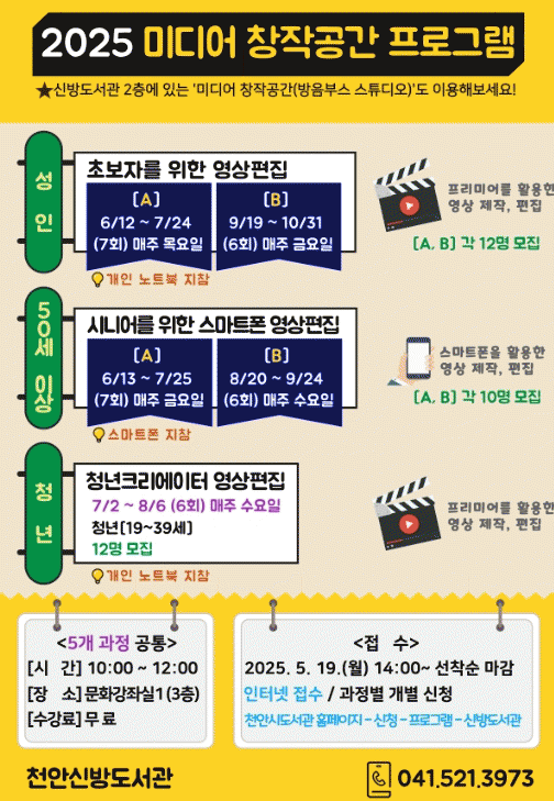 ÇÁ·Î±×·¥Àº ¡ã¼ºÀÎ ´ë»ó Ãʺ¸ÀÚ¸¦ À§ÇÑ ¿µ»óÆíÁý(A), (B) ¡ã50¼¼ ÀÌ»ó ½Ã´Ï¾î¸¦ À§ÇÑ ¿µ»óÆíÁý(A), (B) ¡ã19~39¼¼ û³â ´ë»ó û³âÅ©¸®¿¡ÀÌÅÍ ¿µ»ó ÆíÁý µî 5°³ °úÁ¤À¸·Î ±¸¼ºµÆ´Ù.