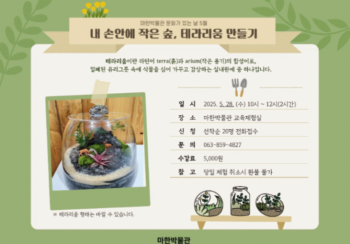 À̹ø ÇÁ·Î±×·¥Àº À¯¸®±×¸© ¾È¿¡ ½Ä¹°À» ½É°í ²Ù¹Ì´Â Å׶󸮿ò ¸¸µé±â üÇèÀ¸·Î ¿À´Â 28ÀÏ ¿ÀÀü 10½ÃºÎÅÍ 12½Ã±îÁö ¸¶Çѹڹ°°ü ±³À°Ã¼Çè½Ç¿¡¼ ÁøÇàµÈ´Ù.