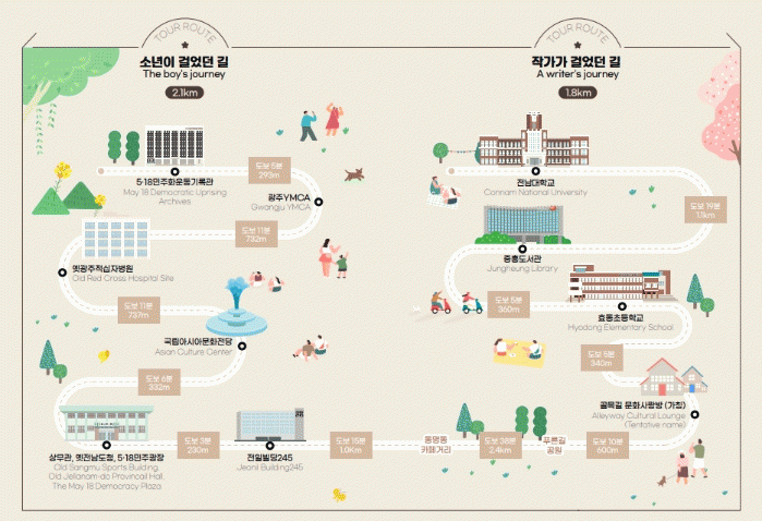 ±¤ÁÖ±¤¿ª½Ã´Â ³ëº§¹®Çлó ¼ö»óÀÚÀÎ ±¤ÁÖ Ãâ½Å ÀÛ°¡ ÇѰÀÇ ¼Ò¼³ ¡®¼Ò³âÀÌ ¿Â´Ù¡¯ÀÇ ÁÖ¿ä Àå¼ÒÀÎ 5¡¤18¹ÎÁÖȿ »çÀûÁö °÷°÷À» ÇϳªÀÇ ±æ·Î ¹Àº ¡®¼Ò³âÀÇ ±æ¡¯À» Á¶¼º, °ÉÀ¸¸ç ޹æÇÒ ¼ö ÀÖ´Â Àι®Åõ¾î¸¦ ¿î¿µÇÑ´Ù.