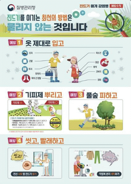 ³óÀÛ¾÷ ¹× ¾ß¿ÜȰµ¿ ½Ã Áøµå±â ³ëÃâÀ» ÃÖ¼ÒÈÇÏ´Â °ÍÀÌ Áß¿äÇϸç, Áøµå±â ±âÇÇÁ¦ »ç¿ë, ±ä¼Ò¸Å ¿Ê, ¸ðÀÚ, ¾ç¸» µîÀ» °®Ãß´Â °ÍÀÌ ¹Ù¶÷Á÷ÇÏ´Ù. ¶ÇÇÑ ¾ß¿ÜȰµ¿ ÈÄ¿£ Áï½Ã ¸ñ¿åÇϰí, ¿ÊÀ» Àß ÅÐ¾î ¼¼Å¹ÇØ¾ß °¨¿°À» ¸·À» ¼ö ÀÖÀ¸¸ç, 2ÁÖ À̳» °í¿, ¿ÀÇÑ, µÎÅë, ±ÙÀ°Åë, ¼³»ç µîÀÇ Áõ»óÀÌ ÀÖÀ¸¸é Áï½Ã ÀÇ·á±â°üÀ» ¹æ¹®ÇØ Áø·á¸¦ ¹Þ¾Æ¾ß ÇÑ´Ù.