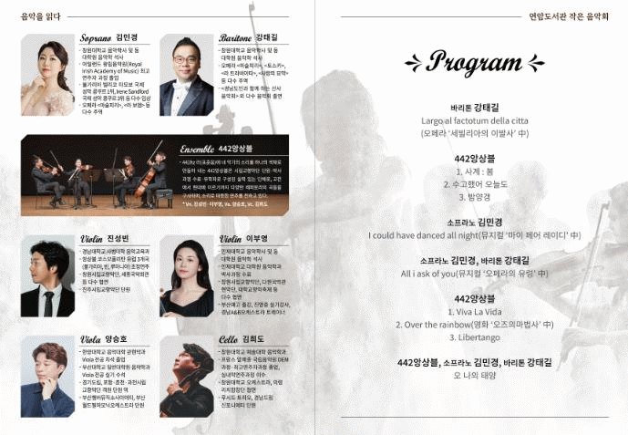 ¡®À½¾ÇÀ» Àд٠: ¿¬¾Ïµµ¼°ü ÀÛÀºÀ½¾Çȸ¡¯¶ó´Â ÁÖÁ¦·Î ¿¸®´Â À̹ø À½¾Çȸ´Â µµ¼°üÀÌ ´Ü¼øÇÑ µ¶¼°ø°£À» ³Ñ¾î º¹ÇÕ¹®È°ø°£À¸·Î¼ °Åµì³ª±â À§ÇØ ¸¶·ÃµÈ Çà»ç·Î Çö¾Ç 4ÁßÁÖ¿Í ÆËÆä¶ó ¼º¾Ç°¡µéÀÇ Çù¿¬ ¹«´ë·Î Ŭ·¡½ÄÀÇ Ç⿬À» ÇѲ¯ ´À³¥ ¼ö ÀÖ´Â °îµé·Î ä¿öÁø´Ù.