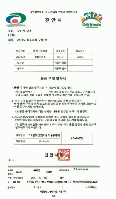 ½Ã Á¶»ç °á°ú õ¾È½Ã ¸íÀÇ·Î ÀÛ¼ºµÈ ¹°Ç°±¸¸ÅÈ®¾à¼´Â À§Á¶ °ø¹®À̸ç, °ø¹®¿¡ ±âÀçµÈ °ø¹«¿ø À̸§µµ ÇãÀ§ÀÎ °ÍÀ¸·Î È®ÀεƴÙ.
