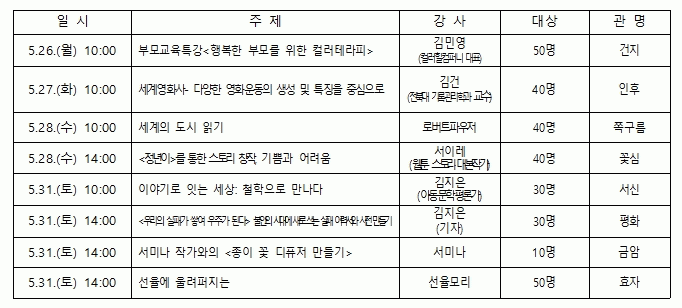 ¶ÇÇÑ Âʱ¸¸§µµ¼°üÀº ¿À´Â 28ÀÏ ¿ÀÀü 10½Ã, ¾ð¾îÇÐÀÚÀÎ ·Î¹öÆ® ÆÄ¿ìÀú ÀÛ°¡¸¦ ÃÊÃ»ÇØ ¡®¼¼°èÀÇ µµ½Ã Àб⡯¸¦ ÁÖÁ¦·Î °¢ µµ½ÃÀÇ ¿ª»ç¼º°ú Á¤Ã¼¼º¿¡ ´ëÇØ »ö´Ù¸¥ °üÁ¡¿¡ ´ëÇØ °øÀ¯ÇÏ´Â °¿¬À» °³ÃÖÇÑ´Ù. ÀÌ¾î °°Àº ³¯ ¿ÀÈÄ 2½Ã, ÀüÁֽø³µµ¼°ü ²É½É¿¡¼´Â ¼ÀÌ·¹ ÀÛ°¡¸¦ ÃÊÃ»ÇØ ¡®Á¤³âÀÌ¡¯¶ó´Â ÀÛǰÀ» ÅëÇØ ±ÛÀ» âÀÛÇÏ´Â °úÁ¤°ú ±× ¼Ó¿¡ ´ã±ä À̾߱âÀÇ Åº»ý ºñȸ¦ µ¶ÀÚµé°ú ³ª´©´Â ÀÚ¸®¸¦ °®´Â´Ù.