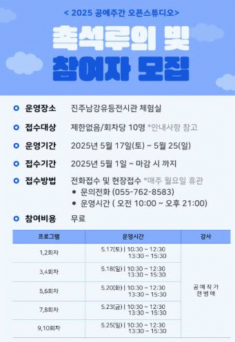 ÀÌ ÇÁ·Î±×·¥Àº °ø¿¹ÀÛ°¡ÀΡ®Àüº´¾Ö¡¯ÀÛ°¡¿Í ÇÔ²² Ã˼®·çÀÇ ºûÀ» ´ãÀº µîÀ» ¸¸µé¾îº¼ ¼ö Àִ üÇè ÇÁ·Î±×·¥À¸·Î 5¿ù 17ÀϺÎÅÍ 25ÀϱîÁö ÃÑ 10ȸÂ÷¸¦ ¿î¿µÇϸç üÇèºñ´Â ¹«·áÀÌ´Ù.