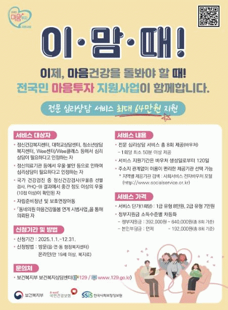 ¼±Á¤µÈ ´ë»óÀÚ´Â ½É¸®»ó´ã ¼ºñ½º Á¦°ø±â°üÀ¸·Î µî·ÏµÈ ±â°ü¿¡¼ ÃÑ 8ȸ(ȸ´ç 50ºÐ ÀÌ»ó)ÀÇ »ó´ãÀ» ¹ÞÀ» ¼ö ÀÖ´Ù.