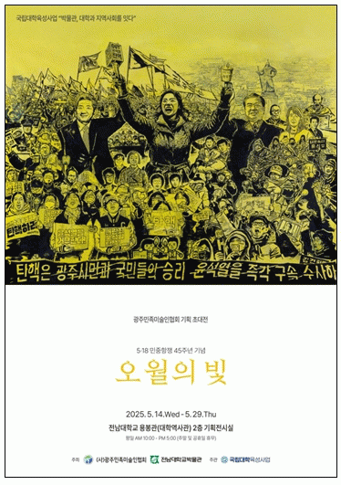 À̹ø Àü½Ã´Â 5¡¤18 ¹ÎÁÖȿÀÌ ´ÜÁö °ú°ÅÀÇ »ç°ÇÀÌ ¾Æ´Ñ, Áö±Ý ÀÌ ½Ã´ë¸¦ »ì¾Æ°¡´Â À̵鿡°Ô ¾î¶² Àǹ̷Π´Ù°¡¿À´ÂÁö¸¦ ÇÔ²² ¼ºÂûÇÏ´Â ÀÚ¸®´Ù. ƯÈ÷ ±¤ÁÖ¹ÎÁ·¹Ì¼úÀÎÇùȸ ÀÛ°¡µé»Ó ¾Æ´Ï¶ó û³â ´ëÇлý, ±×¸®°í û¼Ò³â µ¿¾Æ¸® ¡®µ¿¾ËÀÌ¡¯°¡ ÇÔ²² Âü¿©ÇØ ¼¼´ë °£ ½Ã¼±°ú °¨°¢À» ´ãÀº ÀÛǰ 30¿©Á¡À» ¼±º¸ÀδÙ. ¼·Î ´Ù¸¥ ´«³ôÀÌ¿¡¼ ¹Ù¶óº» ¡®¿À¿ù¡¯ÀÇ Àǹ̴ Àü½Ã °ø°£ ¾È¿¡¼ ¿¹¼ú·Î À¶ÇÕµÇ¾î »õ·Î¿î °¨µ¿À» ¸¸µé¾î³½´Ù.