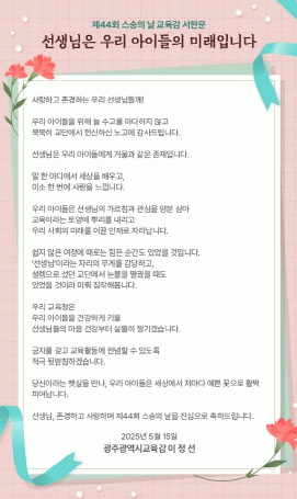 ½Ã±³À°Ã»Àº ¡®Á¦44ȸ ½º½ÂÀÇ ³¯¡¯À» ¸Â¾Æ Áö³ 12ÀÏ ±¤Áֽñ³À°Ã»Çлýµ¶¸³¿îµ¿±â³äȸ°ü¿¡¼ ¡®±³¿ø¿ª·®°³¹ßÁö¿øÀ» À§ÇÑ °ø°¨¡¤¼ÒÅë ÄܼƮ¡¯¸¦ ÁøÇàÇßÀ¸¸ç, ±³±Çº¸È£¡¤±³¿ø¿ª·®°³¹ß ¿¬¼ö µî ±³»ç°¡ ¸¶À½ ³õ°í ±³À°È°µ¿¿¡ Àü³äÇϰí Àü¹®¼ºÀ» ÇÔ¾çÇÒ ¼ö ÀÖ´Â ´Ù¾çÇÑ Á¤Ã¥À» ÃßÁøÇϰí ÀÖ´Ù.