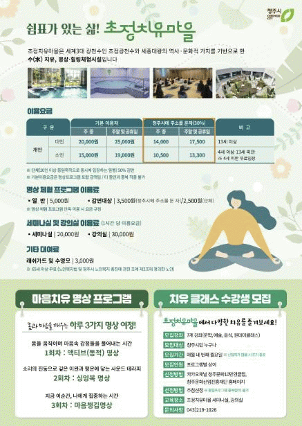 ÃÊÁ¤Ä¡À¯¸¶À»Àº ûÁֽð¡ ûÁ¤ ÀÚ¿¬ ¼Ó ¸ö°ú ¸¶À½À» Ä¡À¯ÇÒ ¼ö ÀÖ´Â °ø°£À» ¸¸µé±â À§ÇØ Áö³ÇØ 10¿ù °³ÀåÇÑ ½Ã¼³ÀÌ´Ù. 3¸¸2õ412§³ ºÎÁö¿¡ °Ç¹° 2°³µ¿°ú Ä¡À¯°ø¿øÀ» °®ÃèÀ¸¸ç, ÃÊÁ¤±¤Ãµ¼ö¸¦ ÀÌ¿ëÇÑ Åº»êÄ¡À¯Ç®°ú ½ºÆÄÄ¡À¯Ç® µîÀ» ¿î¿µÇϰí ÀÖ´Ù.