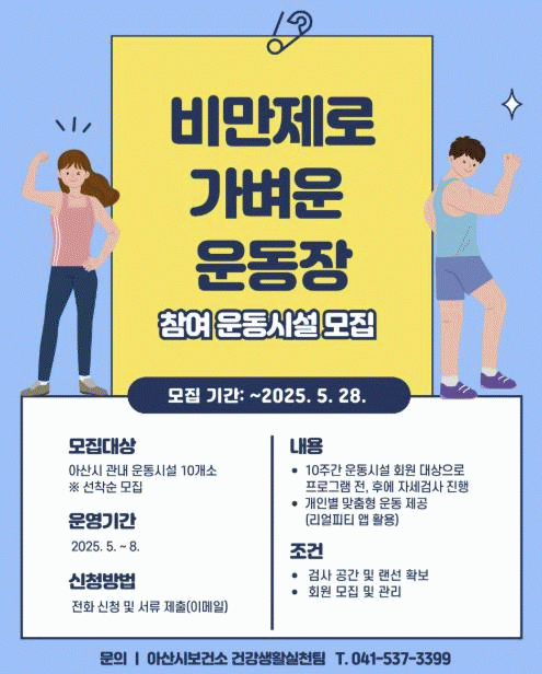 ¡®ºñ¸¸Á¦·Î °¡º¿î ¿îµ¿À塯 ÇÁ·Î±×·¥Àº ¾Æ»ê½Ãº¸°Ç¼Ò¿Í Áö¿ª ¿îµ¿½Ã¼³ÀÌ Çù·ÂÇØ ÀΰøÁö´É ±â¹ÝÀÇ °úÇÐÀû Àåºñ¿Í ½º¸¶Æ® ¾ÛÀ» Ȱ¿ëÇØ °³ÀÎ ¸ÂÃãÇü ¿îµ¿ ÇÁ·Î±×·¥À» Áö¿øÇÏ´Â »ç¾÷ÀÌ´Ù.