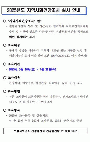 Áö¿ª»çȸ°Ç°Á¶»ç´Â 'Áö¿ªº¸°Ç¹ý' Á¦4Á¶¿¡ µû¸¥ ¹ýÁ¤Á¶»ç·Î, Áúº´°ü¸®Ã»°ú º¸·É½Ã°¡ Çù·ÂÇÏ¿© ¸Å³â ½Ç½ÃÇÏ´Â Á¶»ç´Ù. À̸¦ ÅëÇØ Áö¿ªÁÖ¹ÎÀÇ °Ç°¼öÁØÀ» ÆÄ¾ÇÇÏ°í º¸·É½Ã ½ÇÁ¤¿¡ ¸Â´Â º¸°ÇÁ¤Ã¥ ¼ö¸³À» À§ÇÑ ±âÃÊ Åë°èÀÚ·á·Î Ȱ¿ëµÈ´Ù.