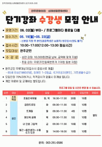 ¼ö°»ý ¸ðÁýÀº ¿À´Â 19ÀϺÎÅÍ 23ÀϱîÁö ¹æ¹® Á¢¼ö·Î ÁøÇàµÇ¸ç ¿ÏÁÖ±º¹ÎÀ̶ó¸é ´©±¸³ª ½ÅûÇÒ ¼ö ÀÖ´Ù.