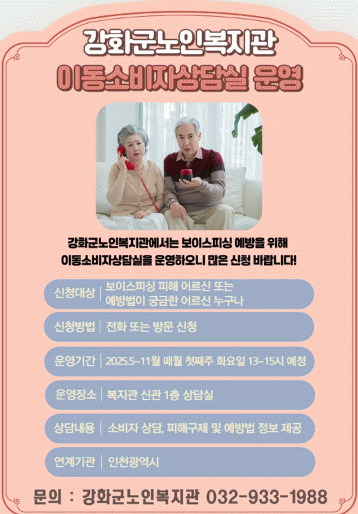 ¡®À̵¿ ¼ÒºñÀÚ »ó´ã½Ç¡¯Àº ÀÎõ±¤¿ª½Ã ¼ÒºñÀÚ »ýȰ¼¾ÅÍÀÇ Áö¿øÀ» ¹Þ¾Æ ¼ÒºñÀÚ »ó´ã ¹× Á¤º¸ Á¢±Ù¿¡ ¾î·Á¿òÀ» °Þ´Â Áö¿ª ³» ¾î¸£½ÅµéÀ» À§ÇØ ¿î¿µµÇ´Â ¼ºñ½ºÀÌ´Ù.