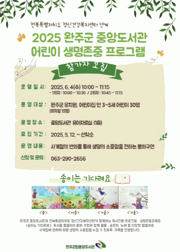 À̹ø ÇÁ·Î±×·¥Àº »ý¸íÀÇ ¼ÒÁßÇÔ°ú ¾î¸°À̵éÀÇ °Ç°ÇÑ ¸¶À½ ¼ºÀåÀ» À§ÇØ µµ¼°ü°ú ÀüºÏƯº°ÀÚÄ¡µµ Á¤½Å°Ç°º¹Áö¼¾ÅͰ¡ ÇÔ²²ÇÏ´Â »ý¸íÁ¸Áß µ¶¼±³À°ÀÌ´Ù.