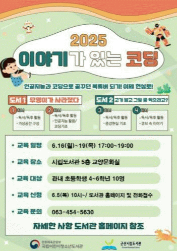 °ÀÇ´Â ÄÚµù Àü¹® °»çÀÇ ÁöµµÇÏ¿¡ ¾î¸°À̵éÀÌ ÁÖÁ¦ µµ¼ ¡®¹«¿µÀ̰¡ »ç¶óÁ³´Ù¡¯¿Í ¡®°í±â ¸»°í ±×·³ ¹» ¸ÔÀ¸¶ó°í?¡¯¸¦ Àаí, À̸¦ ¹ÙÅÁÀ¸·Î ±¸¼ºµÈ 4Â÷½Ã ¿¬°è ÇÁ·Î±×·¥¿¡ Âü¿©ÇÒ ¼ö ÀÖ°Ô ÁøÇàÇÑ´Ù.