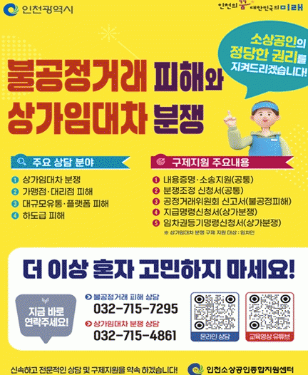 ºÒ°øÁ¤°Å·¡ ÇÇÇØ ¹× »ó°¡ÀÓ´ëÂ÷¿Í °ü·ÃµÈ ¹«·á »ó´ãÀ̳ª Áö¿øÀÌ ÇÊ¿äÇÑ °æ¿ì, ÀÎõ½Ã ¼Ò»ó°øÀÎÁ¤Ã¥°ú ¶Ç´Â ÀÎõ¼Ò»ó°øÀÎÁ¾ÇÕÁö¿ø¼¾ÅÍ °øÁ¤°Å·¡Áö¿øÆÀÀ¸·Î ¹®ÀÇÇÏ¸é µÈ´Ù.
