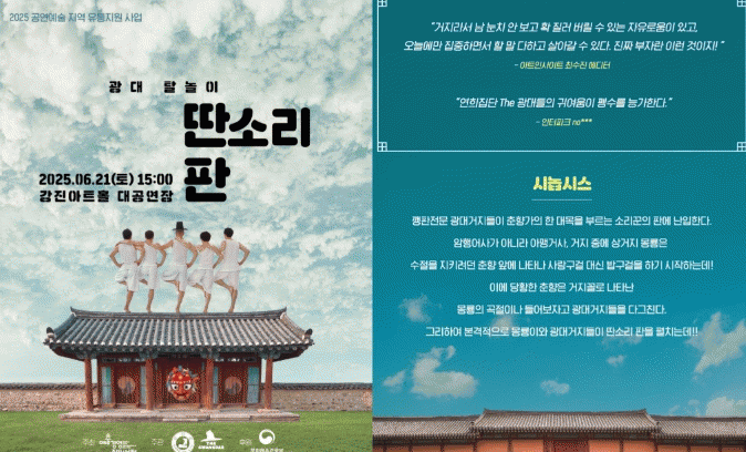 ¡®µý¼Ò¸®ÆÇ¡¯Àº ¹®ÈüÀ°°ü±¤ºÎ°¡ ÈÄ¿øÇϰí (Àç)¿¹¼ú°æ¿µÁö¿ø¼¾ÅͰ¡ ÁÖÃÖÇÏ´Â ¡®°ø¿¬¿¹¼ú Áö¿ª À¯ÅëÁö¿ø »ç¾÷¡¯À» ÅëÇØ °Áø¾ÆÆ®È¦ÀÌ Áö¿ø¹ÞÀº ¿ì¼öÀÛǰ 4Æí Áß ¼¼ ¹øÂ° °ø¿¬ÀÌ´Ù.