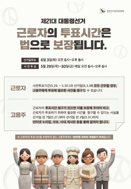 ¶ÇÇÑ, °í¿ëÁÖ´Â ¼±°ÅÀÏ Àü 7ÀÏ(5¿ù 27ÀÏ)ºÎÅÍ ¼±°ÅÀÏ Àü 3ÀÏ(5¿ù 31ÀÏ)±îÁö ±Ù·ÎÀÚ°¡ ÅõÇ¥¿¡ ÇÊ¿äÇÑ ½Ã°£À» û±¸ÇÒ ¼ö ÀÖ´Ù´Â »ç½ÇÀ» ÀÎÅÍ³Ý È¨ÆäÀÌÁö, »çº¸, »ç³» °Ô½ÃÆÇ µîÀ» ÅëÇØ ¾Ë·Á¾ß ÇÑ´Ù.