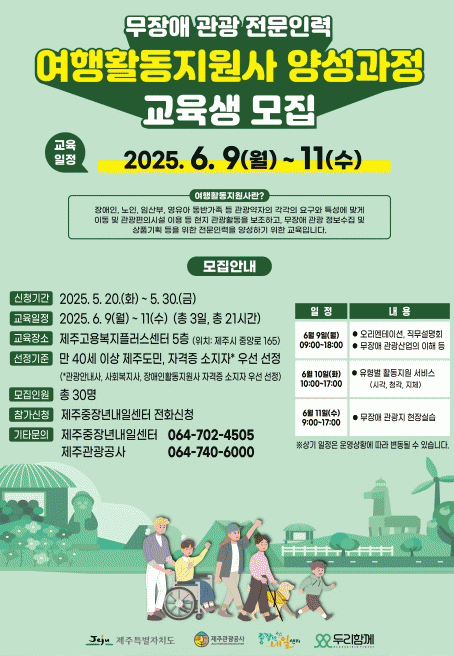 3Àϰ£ ÁøÇàÇÏ´Â ¡®¿©Çà Ȱµ¿ Áö¿ø»ç¡¯ ¾ç¼º°úÁ¤ ±³À°Àº Á¦ÁÖ°í¿ëº¹ÁöÇ÷¯½º¼¾ÅÍ 5Ãþ¿¡¼ ½Ç½ÃÇϸç, Àü¹®°¡ Ư°(¡ã¹«Àå¾Ö °ü±¤ÀÇ ÀÌÇØ ¹× ´ë»óº° Ư¼º ÀÌÇØ¿Í ÀÀ´ë¹ý ¡ãÀ¯Çüº° Àå¾Ö ¿©Çà ¼ºñ½º ¹× ÇöÀå »ç·Ê)°ú ÇÔ²² ¹«Àå¾Ö ¿©Çà Ȱµ¿ Áö¿ø ÇöÀå½Ç½ÀÀÌ À̾îÁø´Ù.