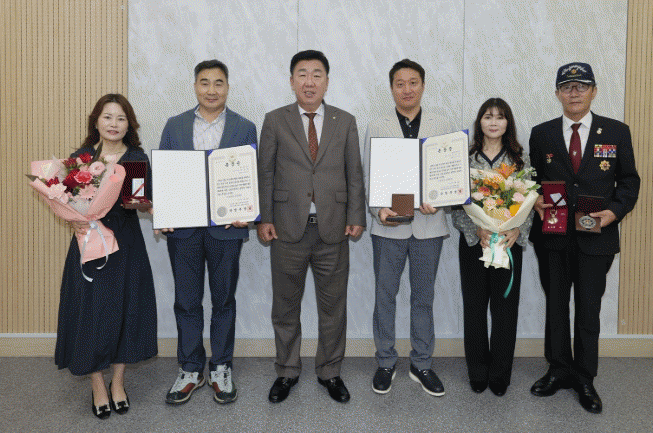 À̹ü¼® ûÁÖ½ÃÀåÀº À̳¯ ÀÓ½Ãû»ç Á÷Áö½Ç¿¡¼ 6?25 ÀüÀï¿¡ ÂüÀüÇØ ÇõÇõÇÑ °øÀ» ¼¼¿î °í(ͺ) ±è¿µÃá ÇÏ»ç¿Í ͺ À̰ÇÐ ÇÏ»çÀÇ À¯Á·¿¡°Ô ȶû¹«°øÈÆÀåÀ» Àü¼öÇß´Ù.