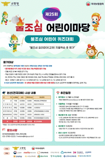 ¿¹¼±Æò°¡´Â ¿À´Â 9¿ù9ÀÏ ±¤ÁÖ¼Ò¹æ¾ÈÀüº»ºÎ ÁÖ°üÀ¸·Î ½Ç½ÃÇϸç, ¿ì¼öÇÑ ¼ºÀûÀ» °ÅµÐ ÇбÞÀº 9¿ù25ÀÏ ¼Ò¹æÃ» º»¼±Æò°¡¿¡¼ ±¤ÁÖ ´ëÇ¥·Î ÃâÀüÇÏ°Ô µÈ´Ù. º»¼± ¿ì½Â Çб޿¡´Â Çѱ¹º¸ÇèÇùȸ¿¡¼ ½Ã»ó±Ý°ú »óÀåÀ» ¼ö¿©ÇÑ´Ù.
