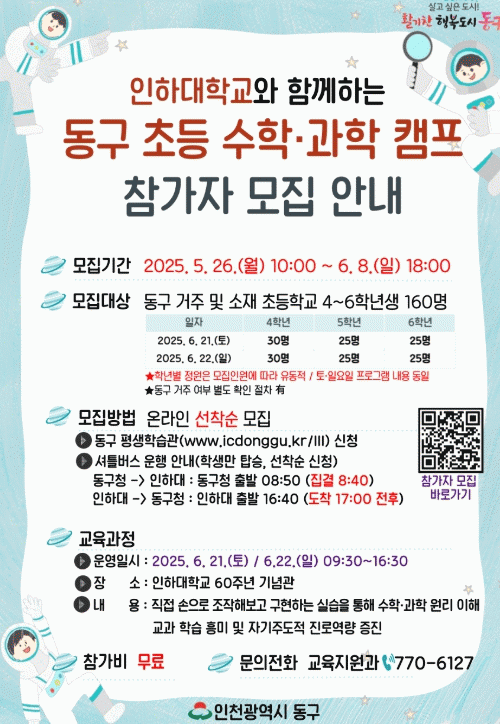 Âü¿©¸¦ Èñ¸ÁÇÏ´Â ÇлýÀº 5¿ù26ÀÏ ¿ÀÀü 10½Ã~6¿ù 8ÀÏ ¿ÀÈÄ 6½Ã±îÁö µ¿±¸ ȨÆäÀÌÁö¸¦ ÅëÇØ ¼±Âø¼øÀ¸·Î ½ÅûÇÒ ¼ö ÀÖÀ¸¸ç, ÀÚ¼¼ÇÑ »çÇ×Àº ±¸Ã» ±³À°Áö¿ø°ú·Î ¹®ÀÇÇÏ¸é µÈ´Ù.