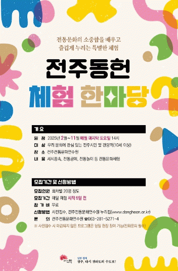 ÀüÁÖµ¿Çå üÇè ÇѸ¶´çÀº Áö³ 2¿ùºÎÅÍ ¿À´Â 11¿ù±îÁö ¸Å¿ù ¸¶Áö¸· ÁÖ Åä¿äÀÏ¿¡ ÁøÇàÇÏ´Â ÇÁ·Î±×·¥À¸·Î, ÇÑ¿Á¸¶À»À» ãÀº ÀüÁֽùΰú °ü±¤°´¿¡°Ô ´Ù¾çÇÑ ÀüÅë¹®È Ã¼Çè ±âȸ¸¦ Á¦°øÇϰí ÀÖ´Ù.