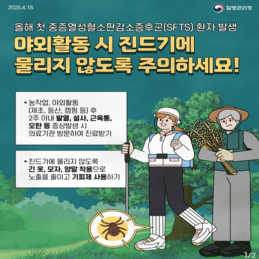 Áúº´°ü¸®Ã»¿¡ µû¸£¸é, Áö³ 4¿ù 15ÀÏ Àü¶óºÏµµ ³²¿ø¿¡¼ ³óÀÛ¾÷ Áß Áøµå±â¿¡ ¹°¸° 80´ë ¿©¼ºÀÌ ¿ÃÇØ óÀ½À¸·Î ÁßÁõ¿¼ºÇ÷¼ÒÆÇ°¨¼ÒÁõÈıº(Severe Fever with Thrombocytopenia Syndrome, SFTS) ¾ç¼º ÆÇÁ¤À» ¹ÞÀº °ÍÀ¸·Î È®ÀεƴÙ.