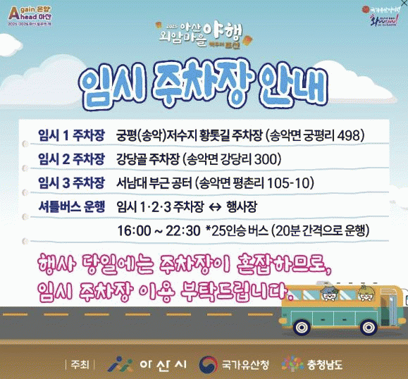 ½Ã´Â ¡ã±ÃÆò(¼Û¾Ç)Àú¼öÁöȲÅê±æ ÁÖÂ÷Àå(¼Û¾Ç¸é ±ÃÆò¸® 498) ¡ã°´ç°ñ ÁÖÂ÷Àå(¼Û¾Ç¸é °´ç¸® 300) ¡ã¼³²´ë ºÎ±Ù °øÅÍ(¼Û¾Ç¸é ÆòÃ̸® 105-10) µî 3°³¼Ò¿¡ ÀÓ½ÃÁÖÂ÷ÀåÀ» ¸¶·ÃÇϰí, ÁÖÂ÷Àå¿¡¼ Çà»çÀå±îÁö ¼ÅƲ¹ö½º 2´ë¸¦ 20ºÐ °£°ÝÀ¸·Î ¿î¿µÇØ ¹æ¹®°´µéÀÇ ÁÖÂ÷ ºÒÆíÀ» ÇØ¼ÒÇÒ °èȹÀÌ´Ù.