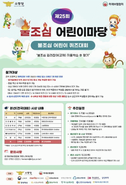 À̹ø Çà»ç´Â ¼Ò¹æÃ»°ú Çѱ¹ÈÀ纸ÇèÇùȸ°¡ °øµ¿ ÁÖÃÖÇϰí, ±³À°ºÎ ¹× ¼ÕÇØº¸Çè»ç°¡ ÈÄ¿øÇÏ´Â Àü±¹ ´ÜÀ§ ¾ÈÀü ±³À° ÇÁ·Î±×·¥À¸·Î, ¾î¸°À̵鿡°Ô ÈÀç ¹× »ýȰ¾ÈÀü¿¡ ´ëÇÑ ±âÃÊ Áö½ÄÀ» ½ÀµæÇÏ°Ô ÇÏ¿© ÀÚÀ²ÀûÀÎ ¾ÈÀüÀÇ½Ä ÇÔ¾ç°ú Á¶±â ¾ÈÀü¹®È È®»êÀ» ¸ñÀûÀ¸·Î ÇÑ´Ù.