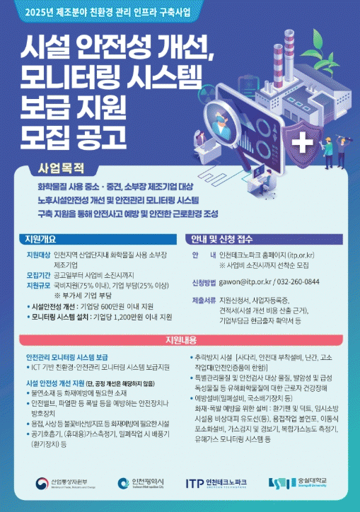 ¡®Á¦Á¶ºÐ¾ß ģȯ°æ °ü¸®ÀÎÇÁ¶ó ±¸Ãà»ç¾÷¡¯Àº ÈÇй°ÁúÀ» »ç¿ëÇÏ´Â Á¦Á¶±â¾÷ÀÇ ½Ã¼³ ¾ÈÁ¤¼º °³¼±À̳ª, ÈÀç ¹× ¾ÇÃ롤À¯Çذ¡½º µî ¾ÈÀü°ü¸® ¸ð´ÏÅ͸µ ½Ã½ºÅÛ ¼³Ä¡¸¦ Áö¿øÇÏ´Â »ç¾÷ÀÌ´Ù.
