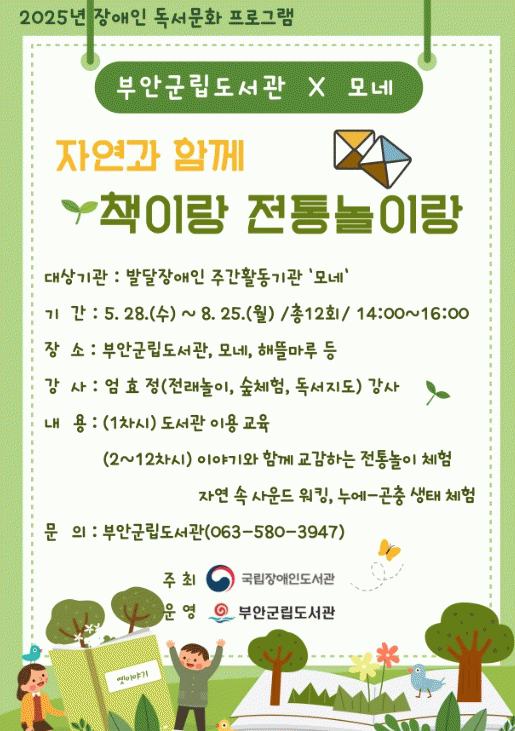 À̹ø »ç¾÷Àº ±¹¸³Àå¾ÖÀεµ¼°üÀÌ ÁÖ°üÇÏ´Â 2025³â Àå¾ÖÀÎ µ¶¼¹®È ÇÁ·Î±×·¥ Áö¿ø »ç¾÷ °ø¸ð¿¡ ¼±Á¤µÅ »ç¾÷ºñ¸¦ Áö¿ø¹Þ¾Æ ¹ß´ÞÀå¾ÖÀÎ ÁÖ°£È°µ¿±â°üÀÎ ¡®¸ð³×¡¯¿Í Çù·ÂÇØ ÁøÇàµÈ´Ù.