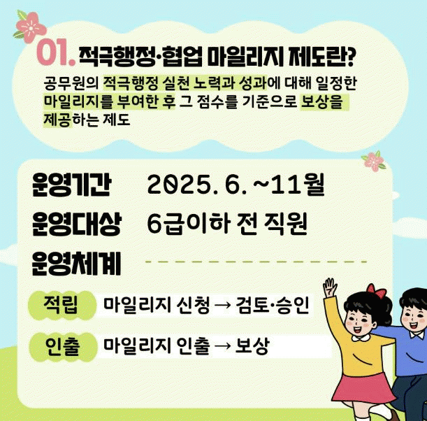 ÇØ´ç Á¦µµ´Â 6±Þ ÀÌÇÏ °ø¹«¿øÀ» ´ë»óÀ¸·Î Çϸç, Àû±ØÇàÁ¤ Ȱµ¿ ½ÇÀû¿¡ µû¶ó ¸¶Àϸ®Áö¸¦ ºÎ¿©Çϰí, À̸¦ Æ÷»ó±Ý, Æ÷»óÈÞ°¡, ±â°üÀå ǥâ µî Àμ¾Æ¼ºê·Î ȯ»êÇÑ´Ù.