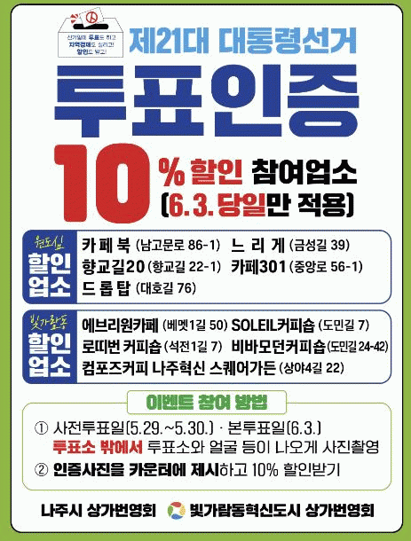 À̺¥Æ®´Â »çÀüÅõÇ¥ÀÏ(5¿ù29ÀÏ~30ÀÏ)°ú º»ÅõÇ¥ÀÏ(6¿ù 3ÀÏ)¿¡ ÅõÇ¥¼Ò ¹Û¿¡¼ ÅõÇ¥¼Ò¿Í ¾ó±¼ µîÀÌ ³ª¿À°Ô ÀÎÁõ»çÁøÀ» ÃÔ¿µÇØ ¸ÅÀå Ä«¿îÅÍ¿¡ Á¦½ÃÇϸé 10% ÇÒÀÎÇØÁÖ´Â ¹æ½ÄÀ¸·Î ÀÌ·ïÁö°í ÇÒÀÎÀº º»ÅõÇ¥ÀÏÀÎ 6¿ù 3ÀÏ ÇÏ·ç µ¿¾È¸¸ Àû¿ëµÈ´Ù.