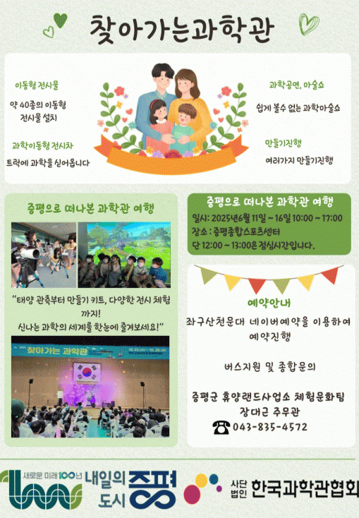 °úÇбâ¼úÁ¤º¸Åë½ÅºÎ°¡ ÁÖÃÖÇÏ´Â À̹ø Çà»ç´Â Æò¼Ò °úÇаüÀ» Á¢Çϱ⠾î·Á¿î Áö¿ª ÁֹεéÀ» À§ÇØ ¸¶·ÃµÈ À̵¿Çü Àü½Ã¡¤Ã¼Çè ÇÁ·Î±×·¥À¸·Î, ¾î¸°ÀÌ¿Í Ã»¼Ò³âÀº ¹°·Ð ¿Â °¡Á·ÀÌ ÇÔ²² °úÇÐÀ» ½±°í Áñ°Ì°Ô ¸¸³¯ ¼ö ÀÖµµ·Ï ±¸¼ºµÆ´Ù.