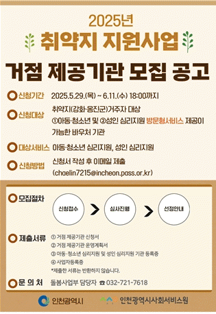 Ãë¾àÁö Áö¿ø»ç¾÷ Áß ¾Æµ¿¡¤Ã»¼Ò³â ½É¸®Áö¿ø, ¼ºÀÎ ½É¸®Áö¿ø ¼ºñ½º Á¦°ø ±â°ü ¸ðÁý °ü·Ã ÀÚ¼¼ÇÑ ³»¿ëÀº ÀÎõ½Ã»çȸ¼ºñ½º¿ø ȨÆäÀÌÁö È®ÀÎÇÒ ¼ö ÀÖ´Ù.