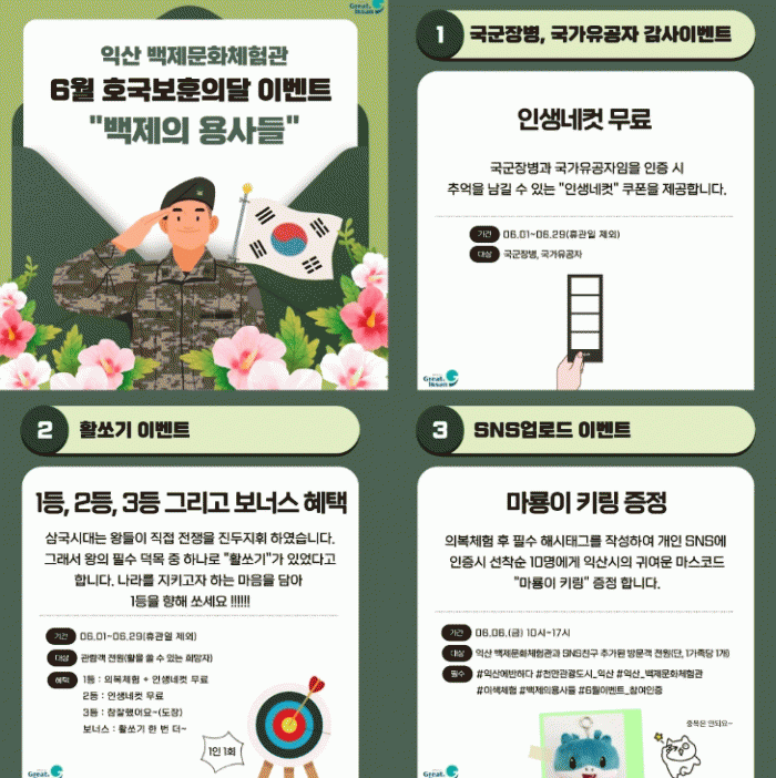 6¿ù 1ÀϺÎÅÍ 29ÀϱîÁö ±¹±ºÀ庴°ú ±¹°¡À¯°øÀÚ¿¡°Ô´Â °¨»çÀÇ ¸¶À½À» ´ã¾Æ Àλý³×ÄÆ ÃÔ¿µ±ÇÀÌ ¹«·á·Î Á¦°øµÈ´Ù.