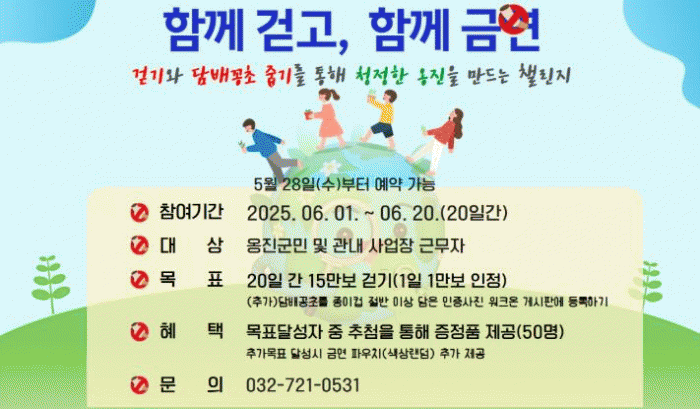 À̹ø 縰Áö´Â ±º¹Î °Ç°ÁõÁø°ú ±Ý¿¬ ȯ°æ Á¶¼ºÀ» À§ÇØ ¿öÅ©¿Â ¾îÇà ³» ¿ËÁø±º Ä¿¹Â´ÏƼ¿¡ °¡ÀÔÇÑ ¿ËÁø±º¹Î°ú °ü³» Á÷ÀåÀÎÀ» ´ë»óÀ¸·Î °È±â ½Çõ°ú ÇÔ²² ´ã¹è²ÇÃÊ Áݱ⠹̼ÇÀ» ºÎ¿©ÇØ Ã»Á¤ÇÑ Áö¿ª»çȸ Á¶¼ºÀ» À¯µµÇÑ´Ù.