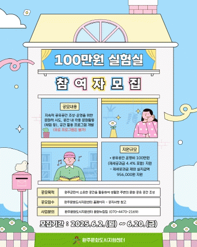 ¡º100¸¸¿ø½ÇÇè½Ç¡»Àº ¿ÏÁÖ±º¹ÎÀ» ´ë»óÀ¸·Î ¿ÏÁÖ±º ¼ÒÀç º»ÀÎ ¼ÒÀ¯ ȤÀº ÀÓ´ë ÁßÀÎ »çÀû °ø°£ ¶Ç´Â À¯ÈÞ°ø°£À» Ȱ¿ëÇØ °ü³» Áֹεé°ú ÇÔ²² ¹®ÈȰµ¿À» ÇÒ ¼ö ÀÖµµ·Ï Áö¿øÇÏ´Â »ç¾÷À¸·Î, ÀÌ´Â ÁֹΠ½º½º·Î ÀÚÀ¯·Ó°í âÀÇÀûÀÎ ¹®ÈÀû ½Ãµµ¿¡ ´ëÇÑ °æÇèÀ» Á¦°øÇÔÀ¸·Î½á ÁֹΠÁÖµµÀÇ ÀÚ¹ßÀû ¹®È »ýŰ踦 Á¶¼ºÇϱâ À§ÇÔÀÌ´Ù.