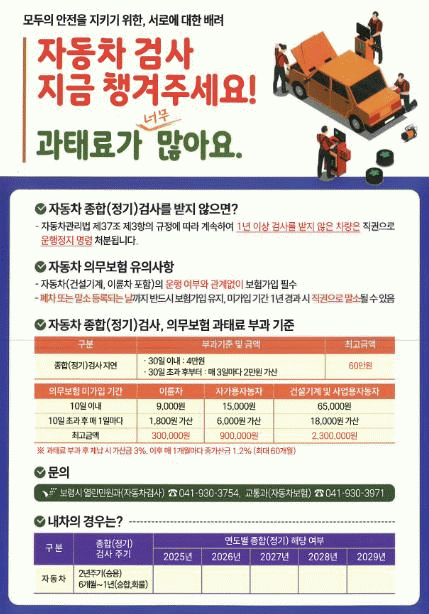 ÇÏ·ç¶óµµ Áö¿¬µÇ¸é °úÅ·á(ÃÖ°í 60¸¸¿ø)°¡ ¹ß»ýÇÏ¸ç °Ë»ç¸í·ÉÀ» ¹Þ°í 1³â ÀÌ»ó °æ°ú ¹Ì°Ë»ç Â÷·®Àº ¿îÇàÁ¤Áö óºÐÀ» ¹Þ°Ô µÈ´Ù.