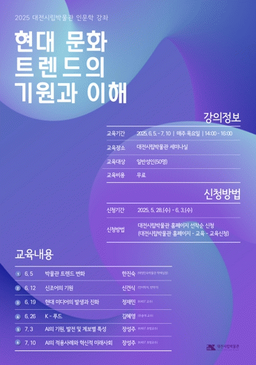 À̹ø °Á´ Çö´ë ¹®È¸¦ °üÅëÇÏ´Â ÁÖ¿ä Ű¿öµåµéÀ» Áß½ÉÀ¸·Î ÃÑ 6ȸ¿¡ °ÉÃÄ ÁøÇàµÈ´Ù. ƯÈ÷ ÃÖ±Ù °¡Àå ÁÖ¸ñ¹Þ´Â ÁÖÁ¦ÀÎ ÀΰøÁö´É(AI)À» Á¶¸íÇϸç, ¡®AIÀÇ ±â¿ø°ú ¹ßÀü¡¯, ¡®AIÀÇ ½ÇÁ¦ Àû¿ë »ç·Ê¡¯¸¦ ÅëÇØ ±â¼ú ±â¹ÝÀÇ »çȸ º¯È¸¦ Ž»öÇÑ´Ù. ¶ÇÇÑ À¯Æ©ºê¿Í ¼Ò¼È¹Ìµð¾î¸¦ Áß½ÉÀ¸·Î ÇÑ ¡®¹Ìµð¾îÀÇ ¹ßÀü°ú ÁøÈ¡¯, ½ÅÁ¶¾î¸¦ ÅëÇØ »ìÆìº¸´Â ´ëÁß ¾ð¾î ¹®ÈÀÇ È帧µµ ´Ù·é´Ù.