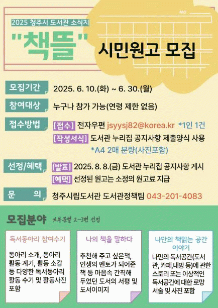 ¼Ò½ÄÁö ¡®Ã¥¶ã¡¯Àº ¸Å³â 11¿ù ¿¬ 1ȸ ¹ß°£µÇ¸ç, ûÁֽà µµ¼°ü »ç¾÷°ú ´Ù¾çÇÑ µ¶¼¹®È¿¡ ´ëÇÑ Á¤º¸¸¦ ´ã°í ÀÖ´Ù. À̹ø ½Ã¹Î ¿ø°í ¸ðÁýÀº ¼Ò½ÄÁö ¹ß°£¿¡ ÀÖ¾î ½Ã¹ÎÀÇ Àû±ØÀû Âü¿©¸¦ À¯µµÇÏ°í ½Ã¹Î ½Ã¼±ÀÇ µ¶¼ °¡Ä¡ °æÇèÀ» °øÀ¯ÇϰíÀÚ ¸¶·ÃµÆ´Ù.