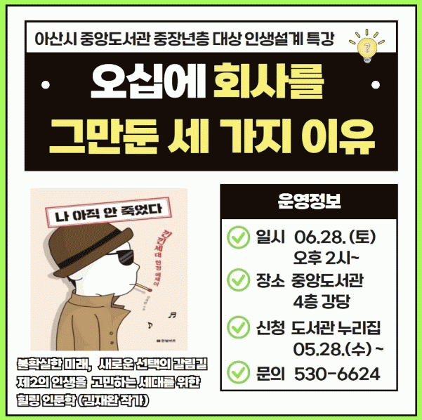 Ư°¿¡´Â ¡®³ª ¾ÆÁ÷ ¾È Á×¾ú´Ù¡¯ÀÇ ÀúÀÚ ±èÀç¿Ï ÀÛ°¡°¡ °¿¬ÀÚ·Î ³ª¼, ÀÚ½ÅÀÇ ½ÇÁ¦ °æÇèÀ» ¹ÙÅÁÀ¸·Î Åð»ç ÀÌÈÄÀÇ »î°ú Àλý Àç¼³°è °úÁ¤¿¡ ´ëÇØ Áø¼ÖÇÏ°Ô Ç®¾î³¾ ¿¹Á¤ÀÌ´Ù.