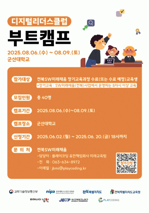 µðÁöÅи®´õ½ºÅ¬·´ÀÇ ºÎƮķÇÁ´Â 8¿ù 6ÀϺÎÅÍ 8¿ù 9ÀϱîÁö ±º»ê´ëÇб³¿¡¼ ÁøÇàµÉ ¿¹Á¤À̰í, SWÀå±â±³À°°úÁ¤(8Â÷½Ã)ÀÌ»óÀ» À̼ö(¶Ç´Â À̼ö ¿¹Á¤ÀÎ) 40¸íÀÇ ÇлýµéÀ» ´ë»óÀ¸·Î SW?AI ±³À°°ú ´Ù¾çÇÑ Ã¼Çè Ȱµ¿À» Á¦°øÇØ µðÁöÅÐ ½ÇÀü ¿ª·® °È ¹× Áø·Î ¼³Á¤¿¡ ½ÇÁúÀûÀÎ µµ¿òÀ» ÁÖ±â À§ÇØ ¸¶·ÃµÆ´Ù.