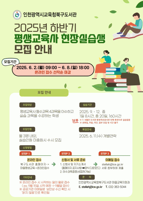 ½Ç½À ½ÅûÀº ºÏ±¸µµ¼°ü ´©¸®Áý¿¡¼ 2ÀϺÎÅÍ ¼±Âø¼ø Á¢¼öÇϸç, ÀÚ¼¼ÇÑ »çÇ×Àº ºÏ±¸µµ¼°ü ´©¸®Áý °øÁö »çÇ×À» Âü°íÇϰųª, ¸¶À»±³À°Áö¿ø°ú·Î ¹®ÀÇÇÏ¸é µÈ´Ù.