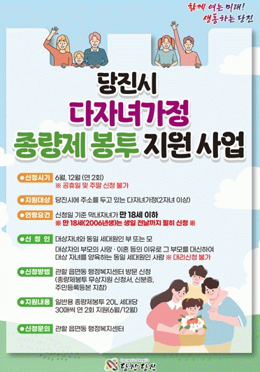 ½Åû ±â°£Àº 6¿ù°ú 12¿ù·Î, ¿¬ 2ȸ °¡´ÉÇÏ¸ç ´ÙÀڳడÁ¤¿¡ ÇØ´çÇÏ´Â ´çÁø½Ã¹ÎÀº ½ÅºÐÁõ°ú Áֹεî·Ïµîº»À» ÁöÂüÇØ °ÅÁÖÁö À¾¸éµ¿ ÇàÁ¤º¹Áö¼¾ÅÍ¿¡ ¹æ¹® ÈÄ, ½Åû¼¸¦ ÀÛ¼ºÇØ Á¾·®Á¦ºÀÅõ(20L) 30¸Å¸¦ ¼ö·ÉÇÒ ¼ö ÀÖ´Ù.
