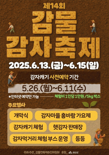 °¨ÀÚij±â üÇèÀº Á÷Á¢ ¹ç¿¡ µé¾î°¡ °¨ÀÚ¸¦ ¼öÈ®ÇÏ¸ç ³óÃÌÀÇ ÀÚ¿¬°ú ¿©À¯¸¦ üÇèÇÒ ¼ö ÀÖ´Â ÇÁ·Î±×·¥À¸·Î, ÃàÁ¦ÀÇ ´ëÇ¥ Àαâ ÄڳʴÙ. ¸Å³â Á¶±â ¸¶°¨µÇ´Â Çà»çÀÎ ¸¸Å ½ÅûÀ» ¼µÎ¸£´Â °ÍÀÌ ÁÁ´Ù.
