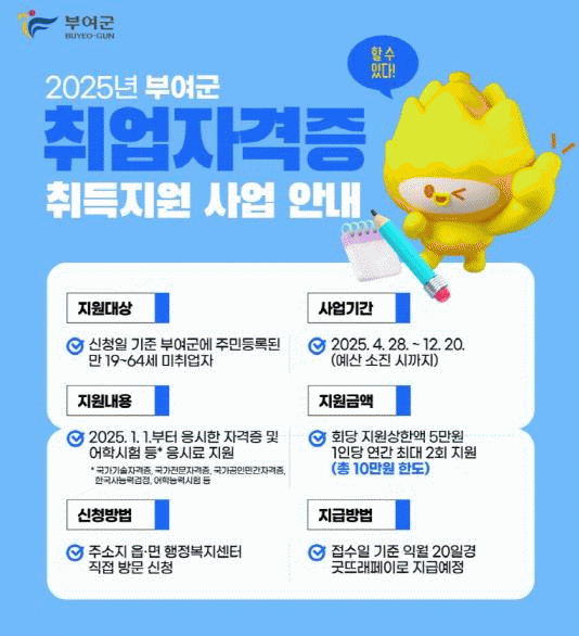Áö¿ø ´ë»ó ½ÃÇèÀº ¡ã±¹°¡±â¼úÀÚ°ÝÁõ ¡ã±¹°¡Àü¹®ÀÚ°ÝÁõ ¡ã±¹°¡°øÀιΰ£ÀÚ°ÝÁõ ¡ã¾îÇнÃÇè(TOEIC µî) ¡ãÇѱ¹»ç´É·Â°ËÁ¤½ÃÇèÀÌ´Ù. 2025³â 1¿ù 1ÀÏ ÀÌÈÄ ÀÀ½ÃÇÑ ½ÃÇè¿¡ ÇÑÇØ 1ȸ ÃÖ´ë 5¸¸ ¿ø, ¿¬ 2ȸ ÃÖ´ë 10¸¸ ¿ø±îÁö ÀÀ½Ã·á¸¦ Áö¿ø¹ÞÀ» ¼ö ÀÖ´Ù. Áö¿ø±ÝÀº ºÎ¿©±º Áö¿ªÈÆó ¡®±Â¶ß·¡ÆäÀÌ¡¯¸¦ ÅëÇØ Áö±ÞµÇ¸ç, ½ÅûÀÚ´Â »çÀü¿¡ ±Â¶ß·¡ÆäÀÌ¿¡ °¡ÀÔÇØ¾ß ÇÑ´Ù.