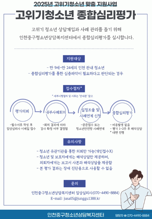 ´ë»ó û¼Ò³â¿¡°Ô´Â ºñ¿ë ºÎ´ã ¾øÀÌ ½ÉÃþ ½É¸® Æò°¡¸¦ Áö¿øÇϰí, ÀÇ·ÚÀÚ¿Í º¸È£ÀÚ¿¡°Ô´Â ÇØ¼® »ó´ãÀ» Á¦°øÇÑ´Ù.