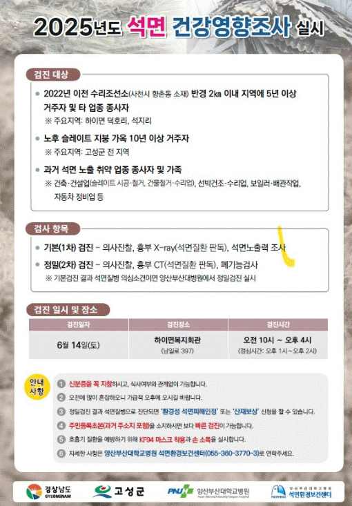 À̹ø °ËÁøÀº °æ»ó³²µµ ÁÖ°üÀ¸·Î ¾ç»êºÎ»ê´ëÇб³º´¿ø ¼®¸éȯ°æº¸°Ç¼¾ÅÍ À̵¿ °ËÁø¹ö½º°¡ ÇÏÀÌ¸é º¹Áöȸ°üÀ» ¹æ¹®ÇÏ¿© ¿ÀÀü 10½ÃºÎÅÍ ¿ÀÈÄ 4½Ã(Á¡½É½Ã°£ 12½Ã~¿ÀÈÄ1½Ã´Â ¹Ì°ËÁø)±îÁö ÁøÇàÇÏ¸ç °ËÁøÀ» Èñ¸ÁÇÏ´Â ±º¹ÎÀº º°µµÀÇ ¿¹¾à ¾øÀÌ ½ÅºÐÁõ¸¸ ÁöÂüÇÏ¸é ¹«·á·Î °ËÁøÀ» ¹ÞÀ» ¼ö ÀÖ´Ù.